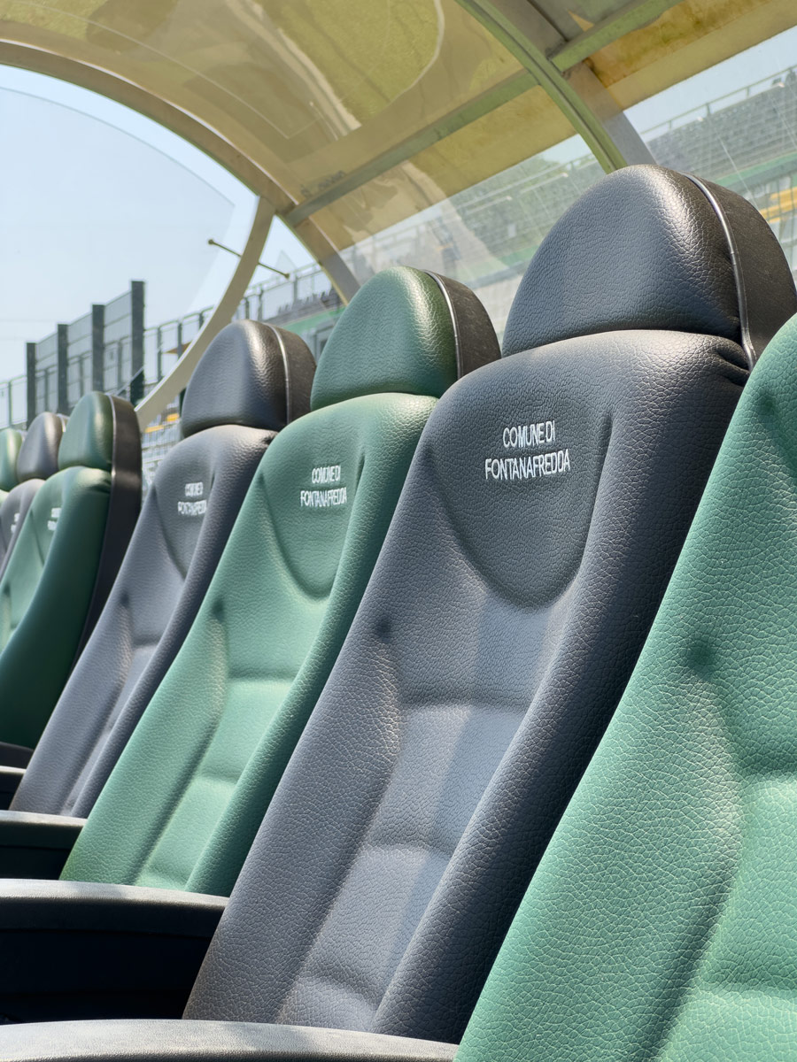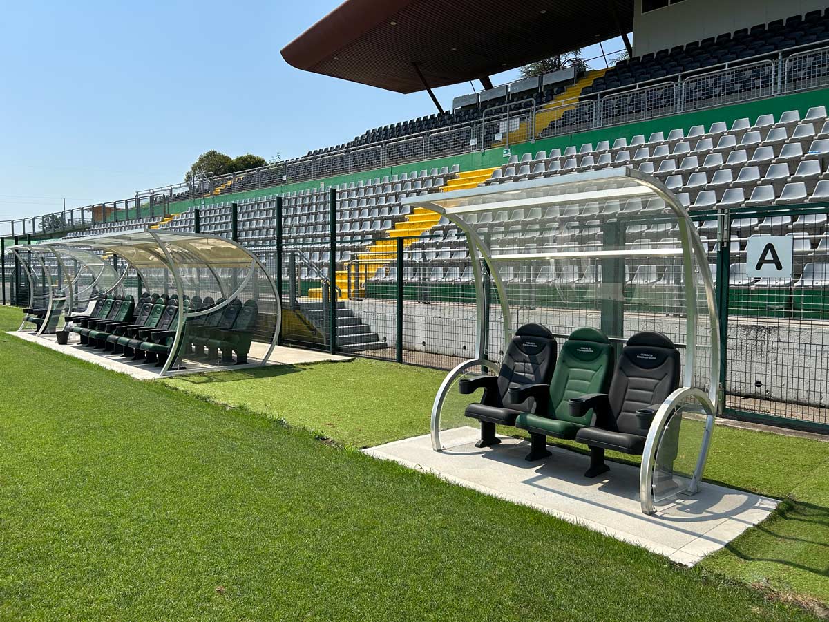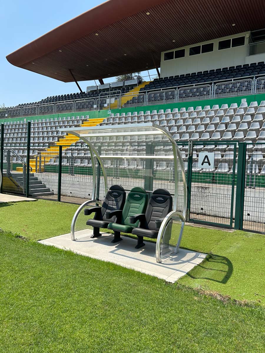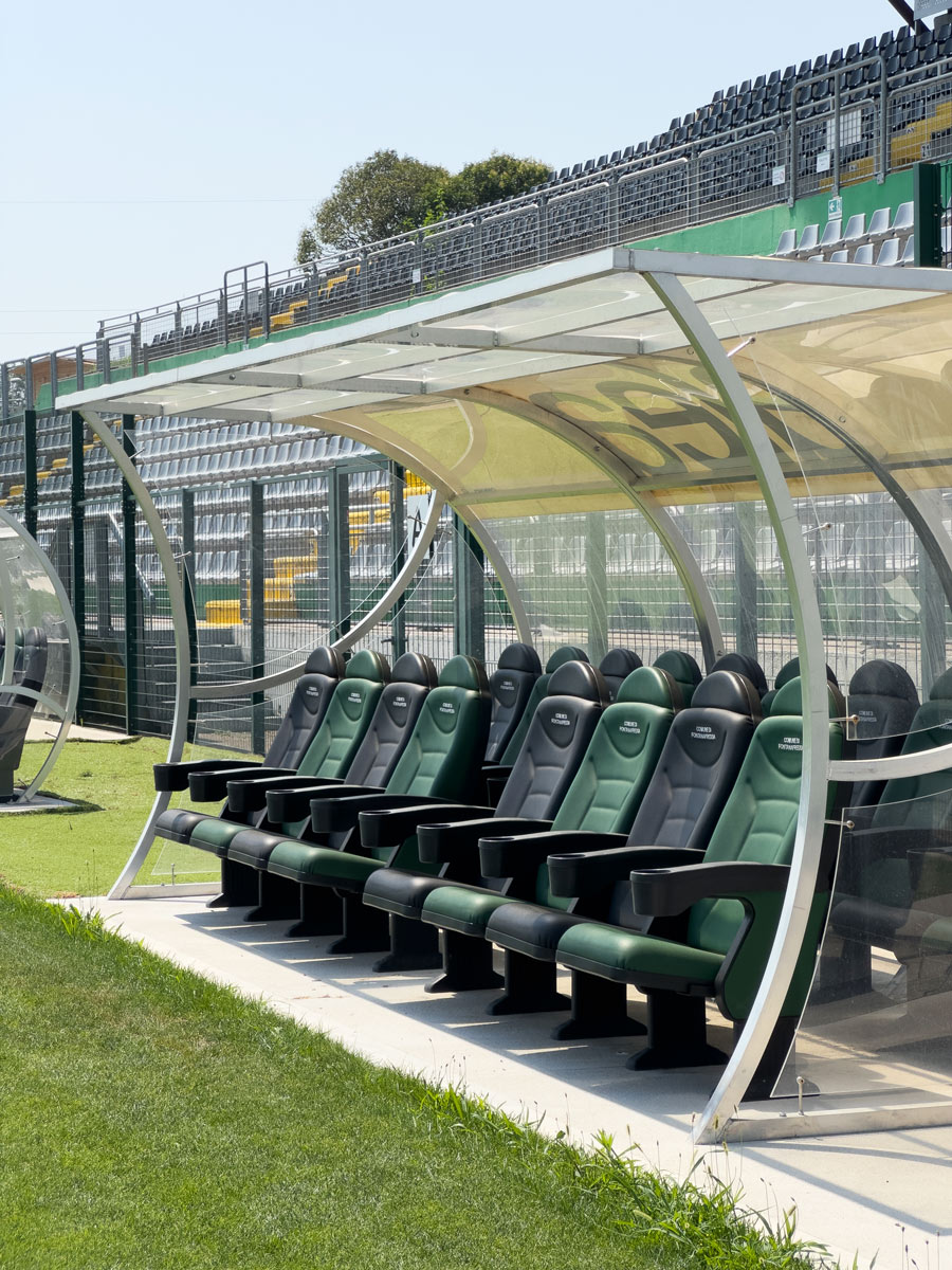 Construction of five "World Cup" model team shelters (our item 6206), with a total seating capacity of 54 spots, complete with comfortable seats in alternating colours on request, with embroidered logo and armrest equipped with cup holder.
