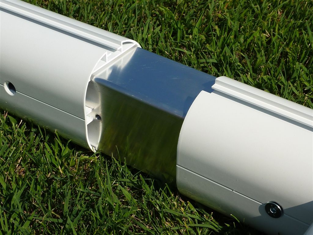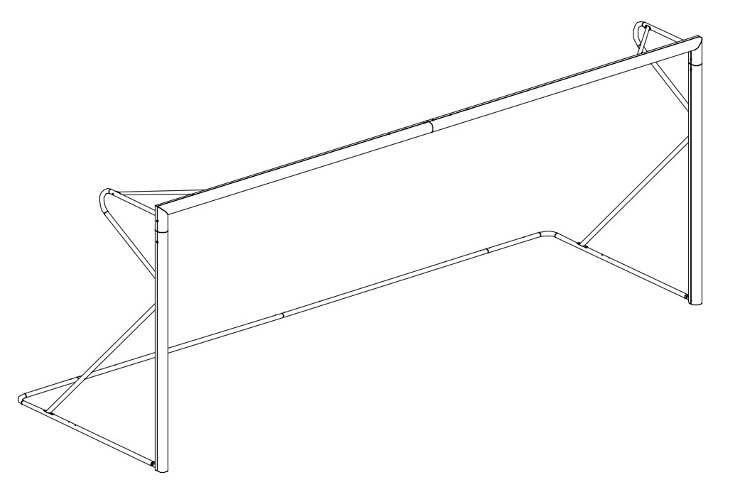 I gomiti sono saldati e le giunzioni interne sono in profilo ad alto spessore in alluminio lega speciale 6005, al fine di rendere la porta ancora più stabile e robusta. Traversa realizzata in due pezzi con sistema "no-gravity" per garantire l'assenza di deformazioni e mantenerla parallela al campo.