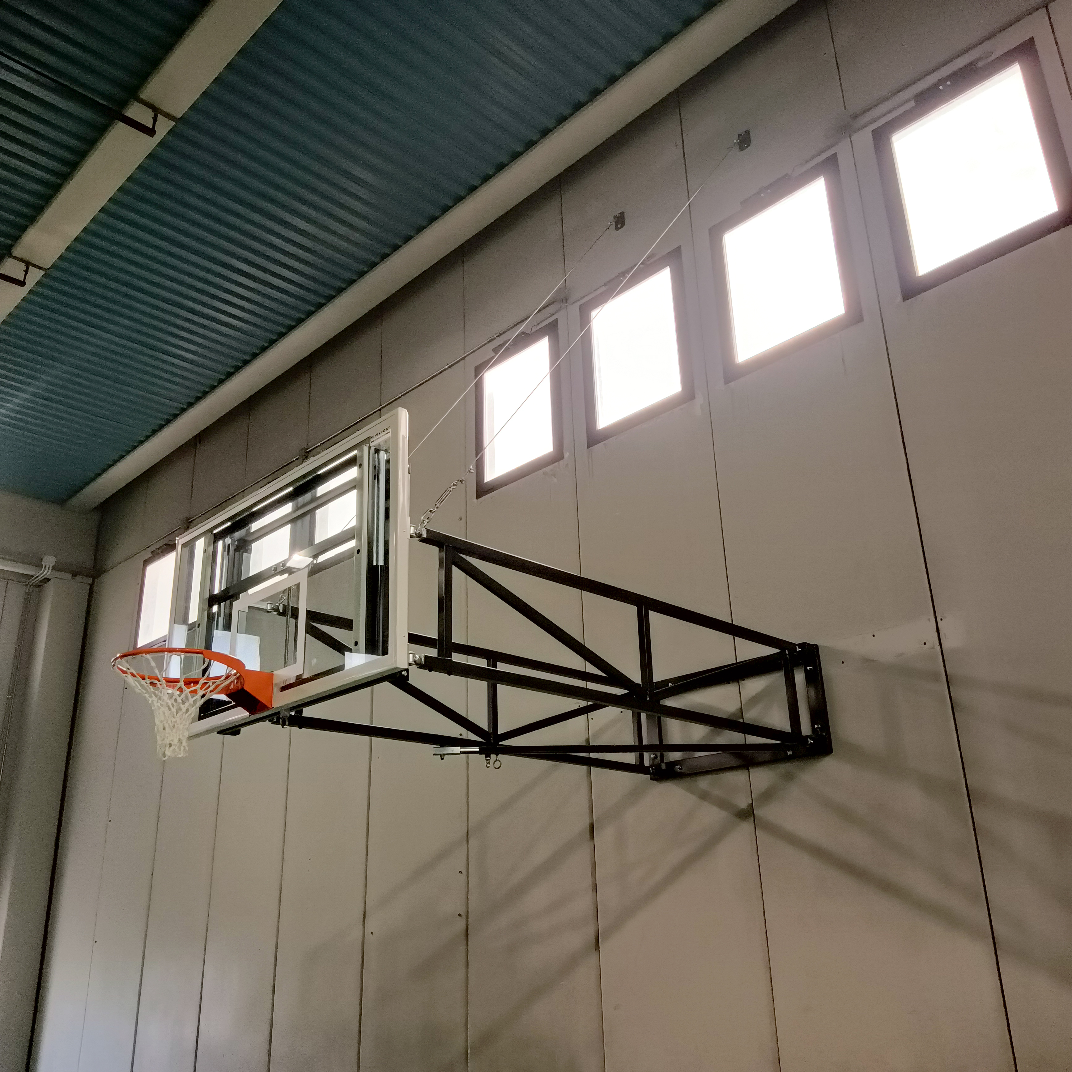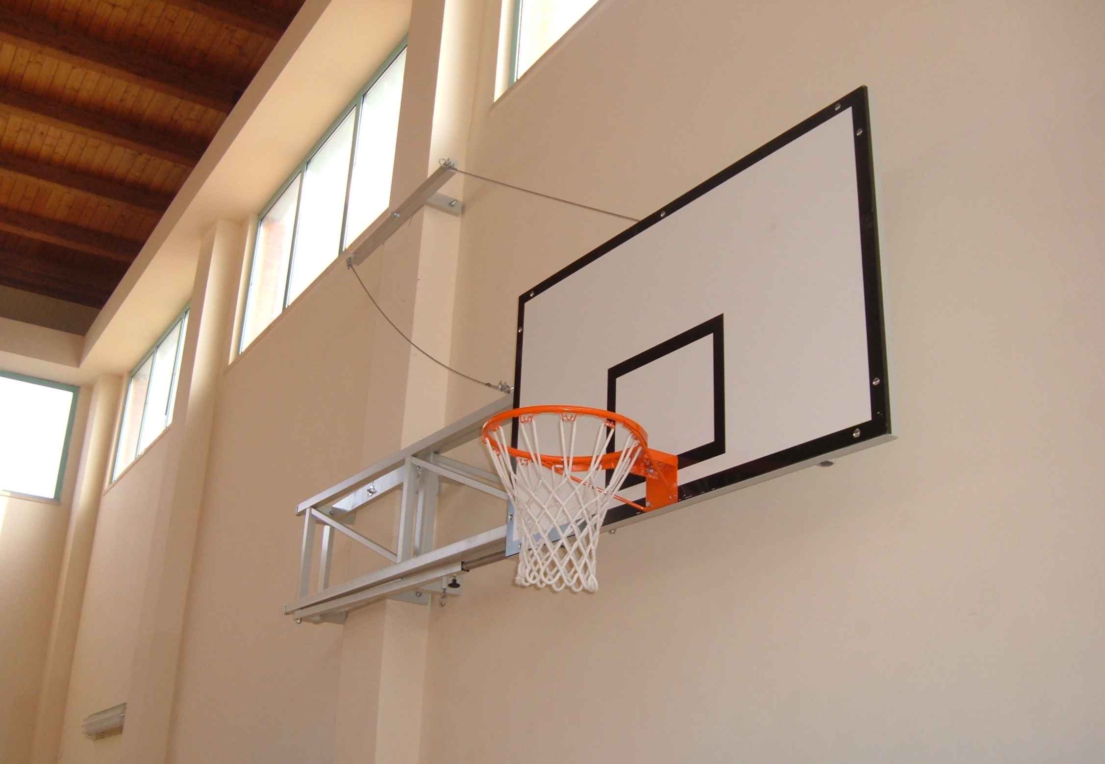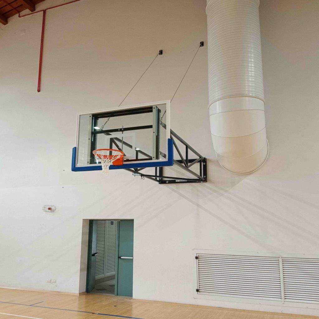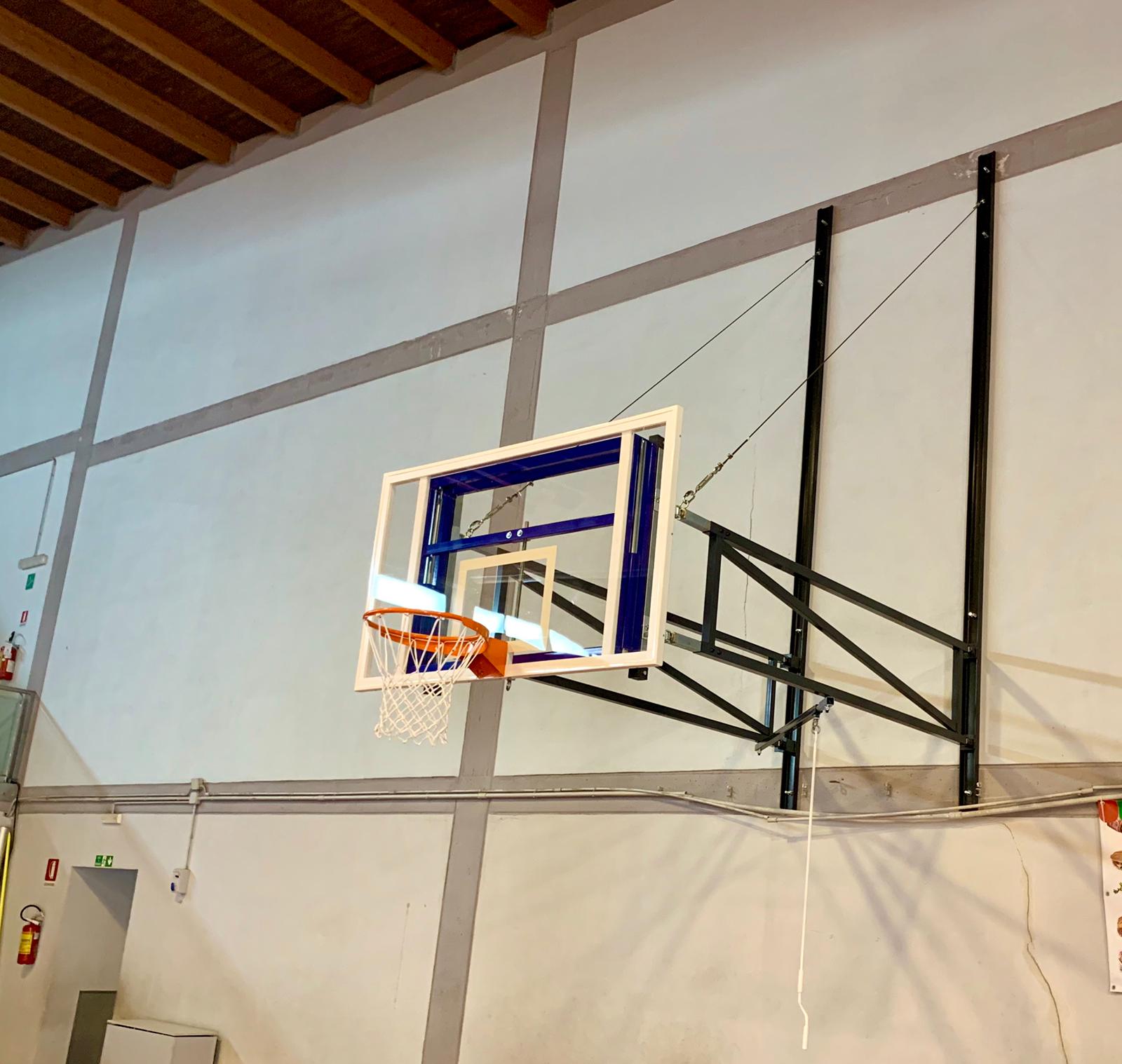 Impianto basket/minibasket a parete, a sbalzo personalizzato e regolabile, pieghevole a libro lateralmente, con cavi.