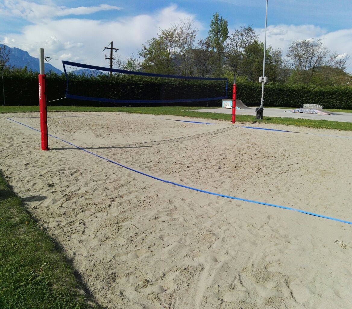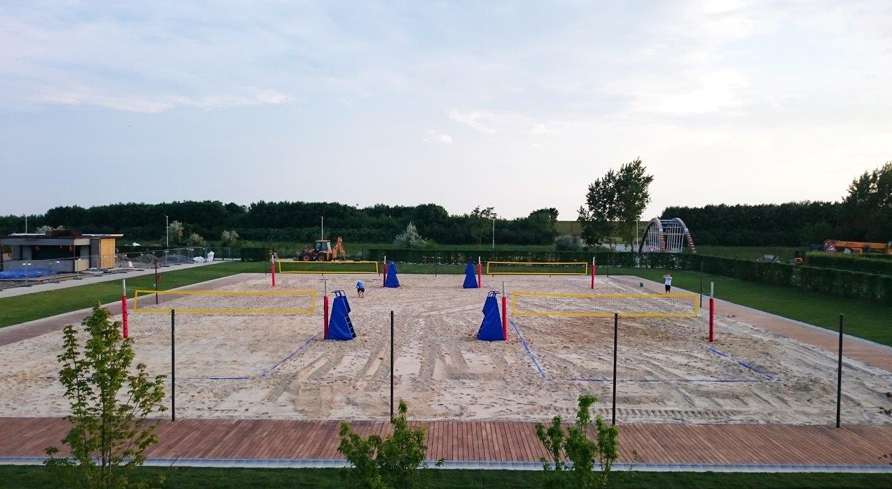 Impianto beach volley profesionale con palo diam. 102 mm. tropicalizzato, scorrevoli tropicalizzati, completo di tendirete, basamento in acciaio con travi di legno per aumentare la stabilità.