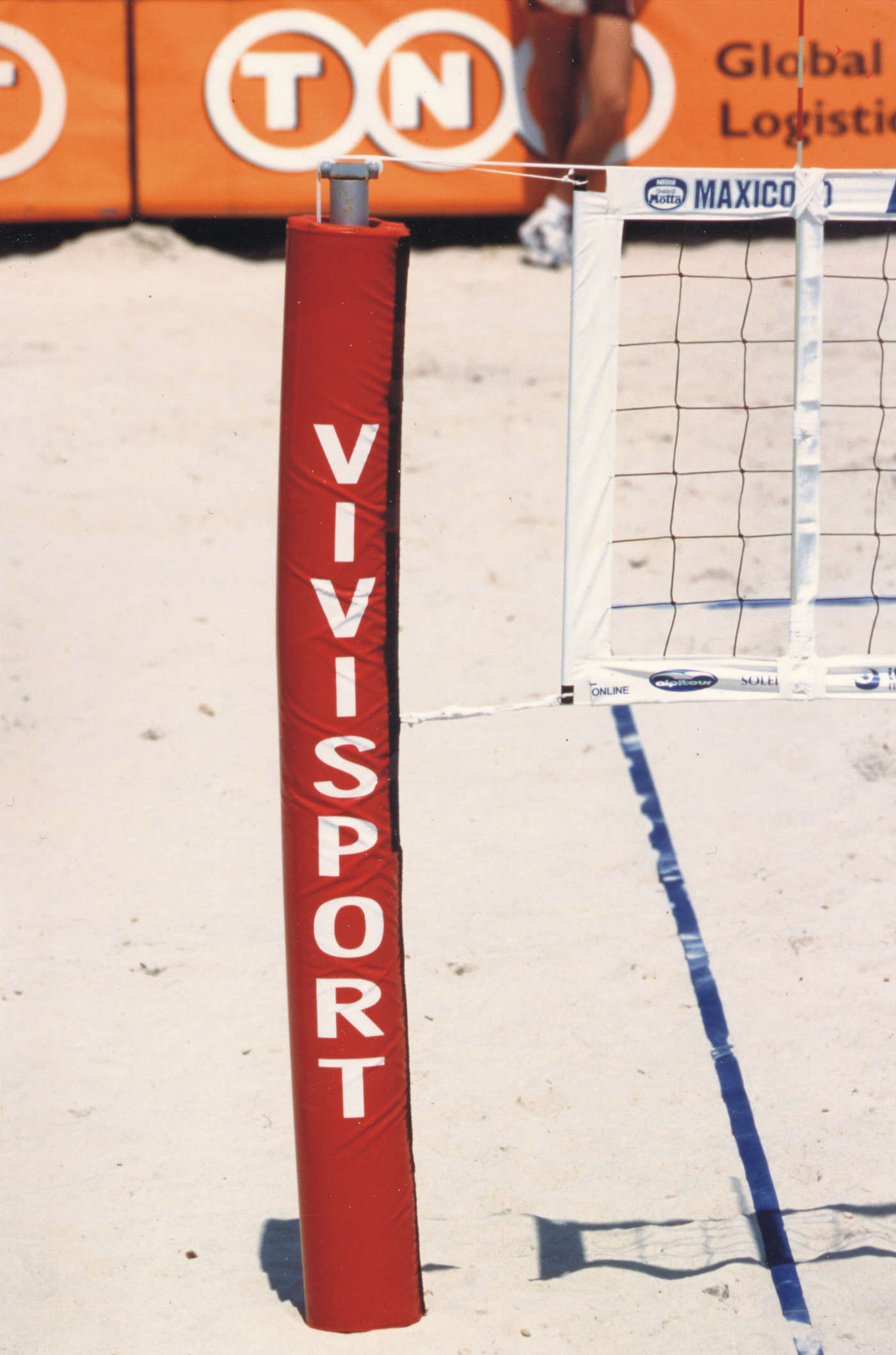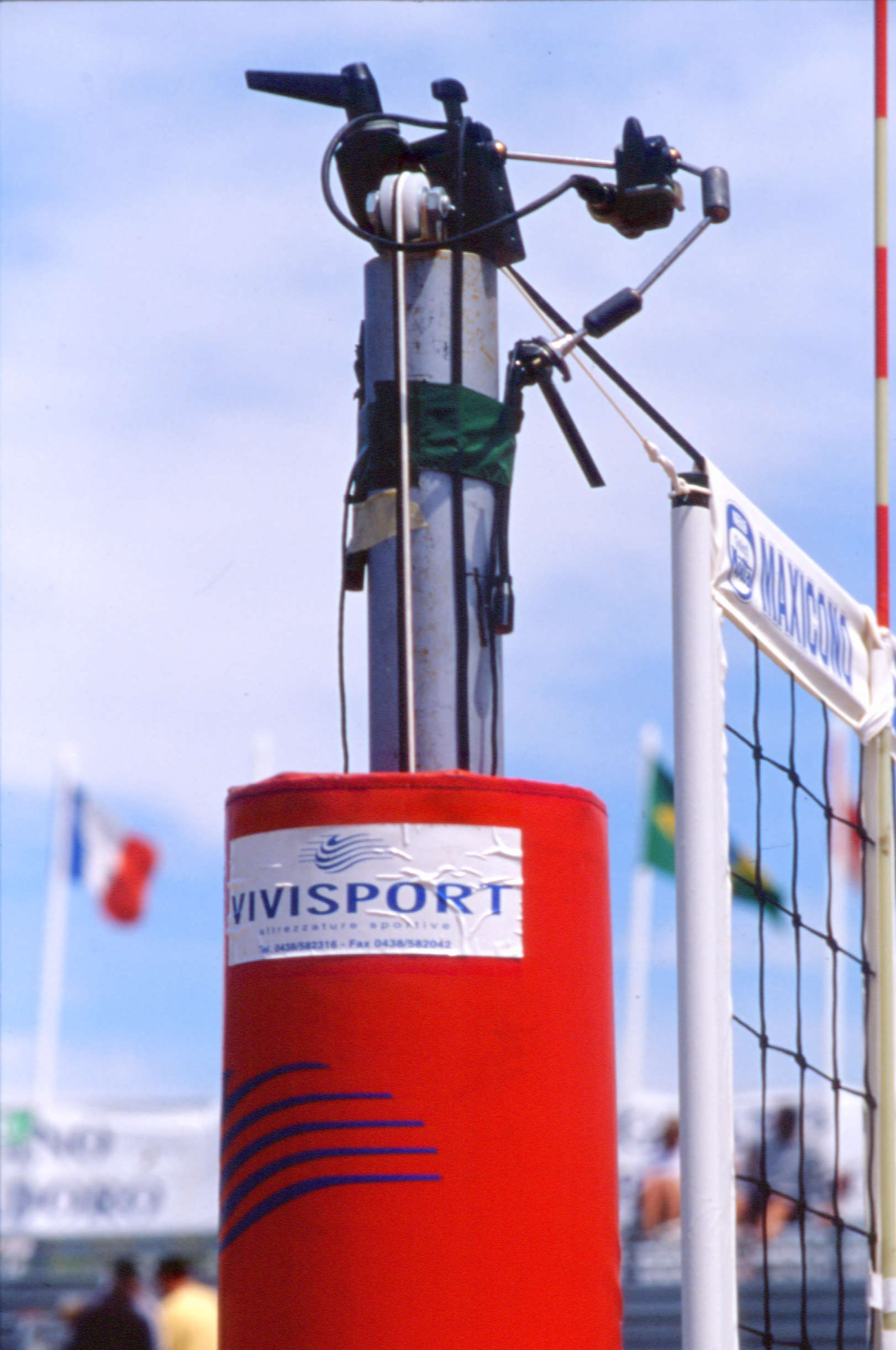 Impianto beach volley in acciaio zinc.a periscopio doppia rotella in teflon per scorrimento cavo rete, a norma F.I.P.A.V.. Attrezzo ufficiale world tour 2000-2001 tappe italiane torneo femminile e maschile campionati italiani beach-volley 2001 gazzetta dello sport.