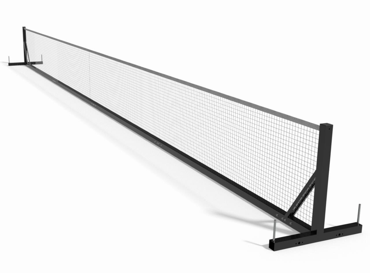 Impianto tennis trasportabile su ruote. Realizzato in tubolare di acciaio quadro da mm.80x80. I pali reggirete sono uniti fra loro da una traversa in tubo di acciaio sezione mm. 80x80. Pali dotati di perni portazavorra per dare la massima stabilità ed una ottima trazione della rete. Si consigliano 50 kg per ogni palo per un totale di 100 kg di dischi in ghisa su ogni montante. Meccanismo a ruote per il trasporto composto da 6 ruote girevoli che rendono agevole lo spostamento dell'impianto.
