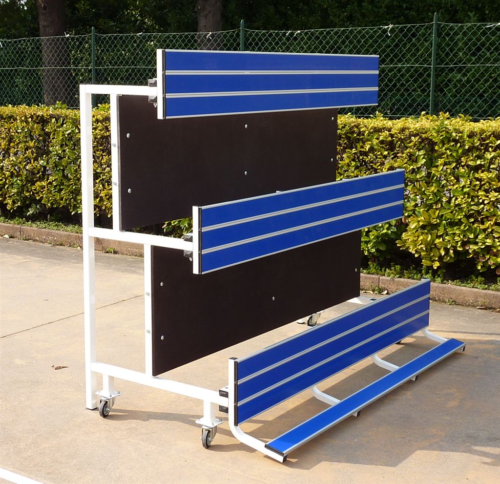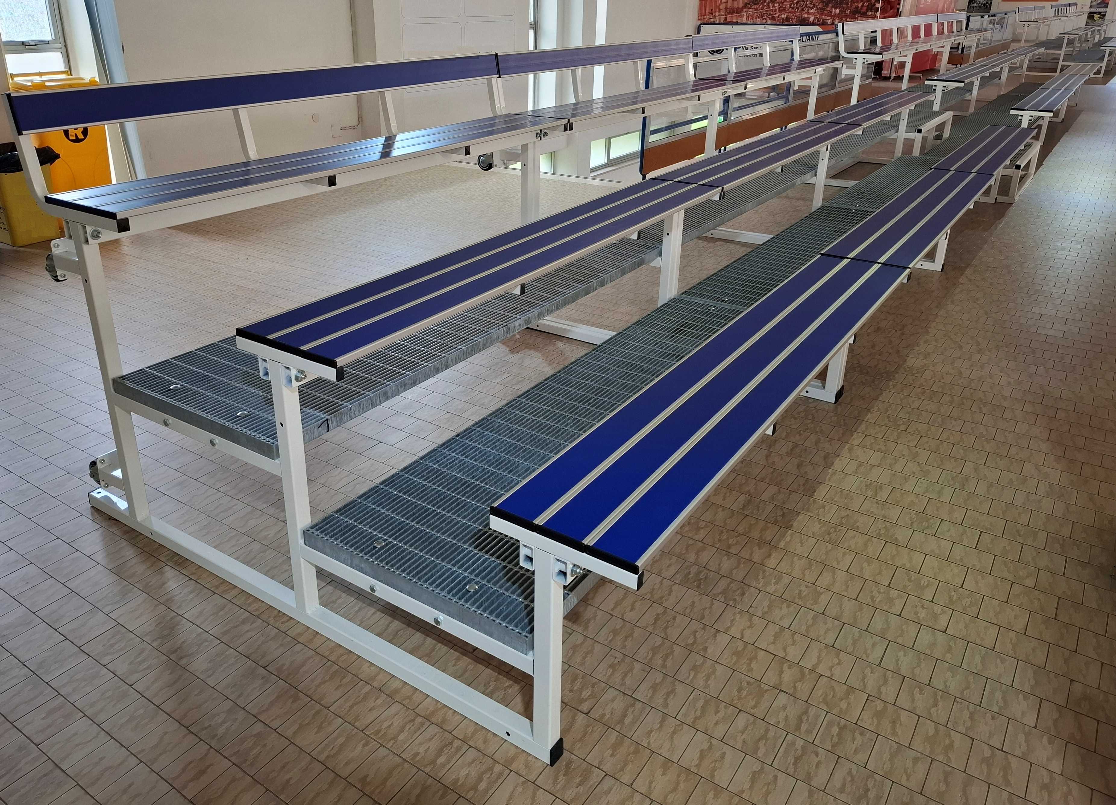 Modulo tribuna da 2 metri a 3 file in acciaio verniciato, ribaltabile e trasportabile con ruote. seduta composta da doghe in alluminio anodizzato con inserto in pvc colore blu.