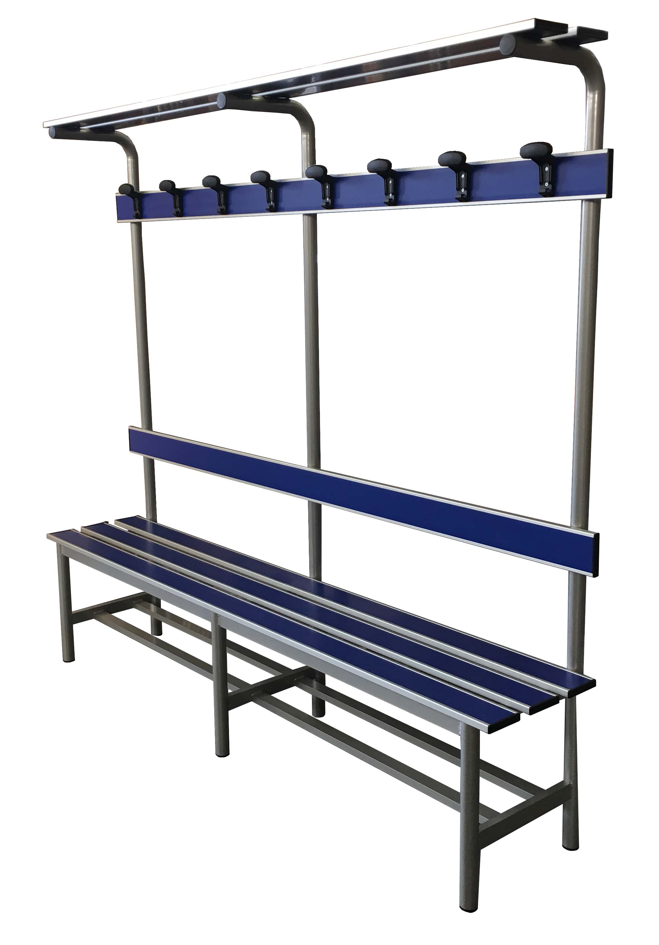 Panca spogliatoio con seduta, schienale, appendiabiti e piano appoggia borse, lunghezza 2 metri, struttura verniciata in tubolare tondo di alluminio di diametro 40 mm.