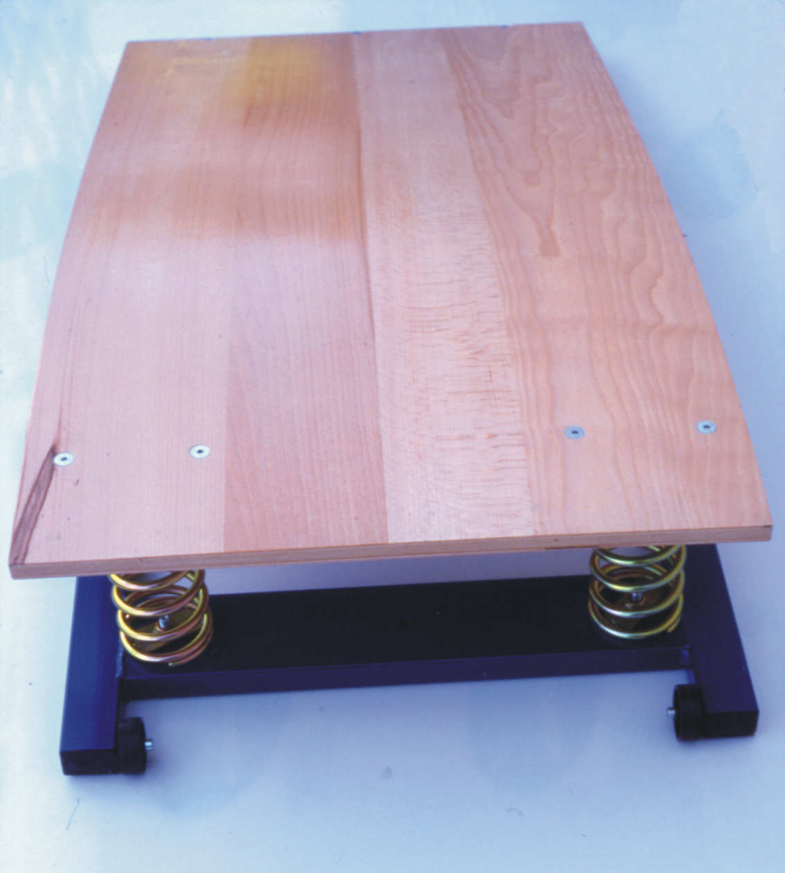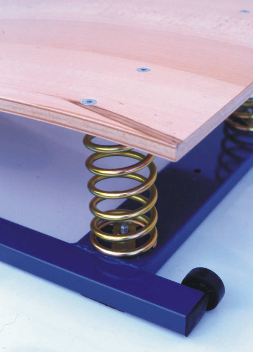Pedana elastica doppia molla in acciaio con piano di battuta in legno lamellare vernicato al naturale sostenuto da 2 molloni in acciaio posti su telaio in acciaio zincato, ruote per il trasporto. Piano superficie cm.120x60.