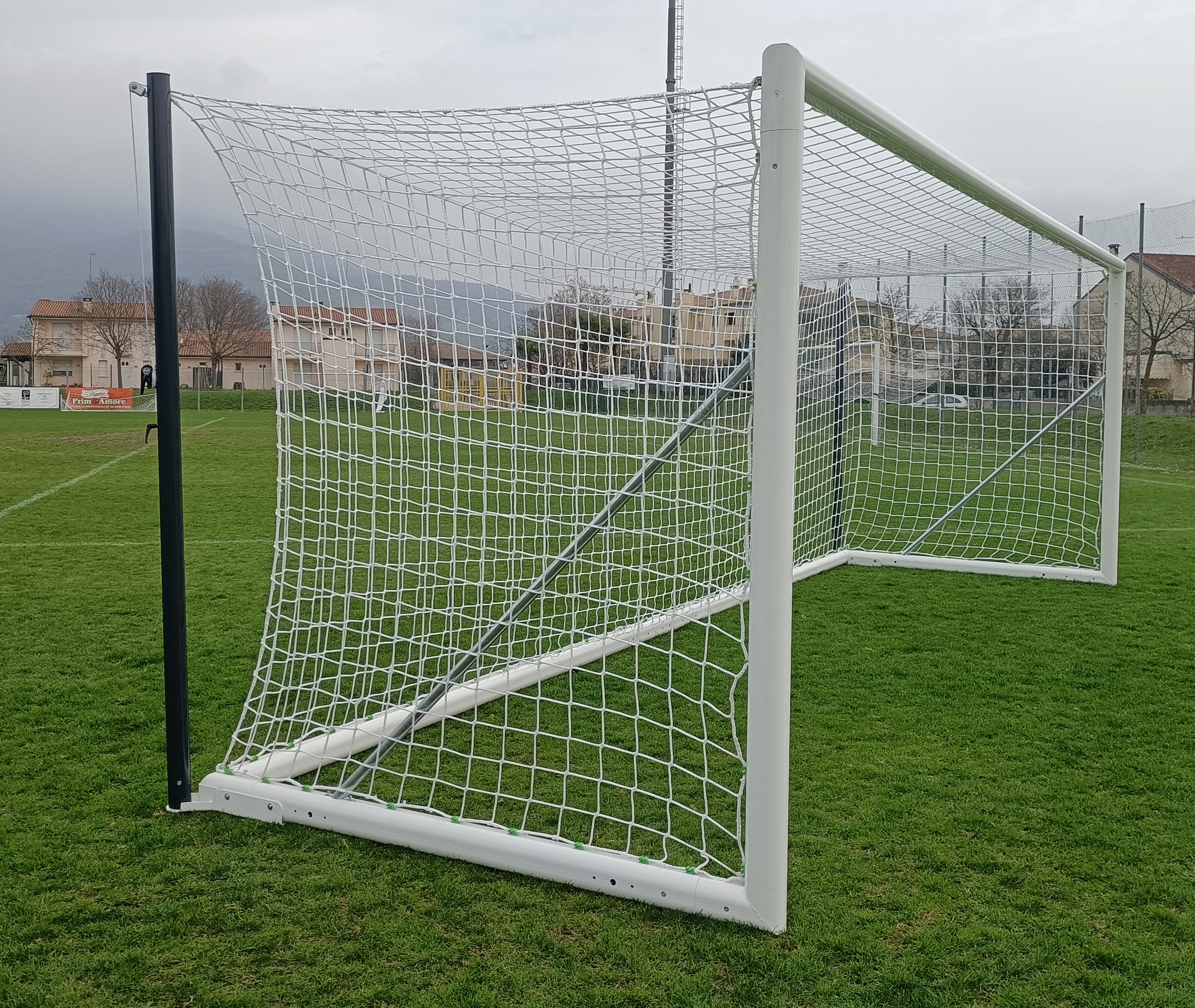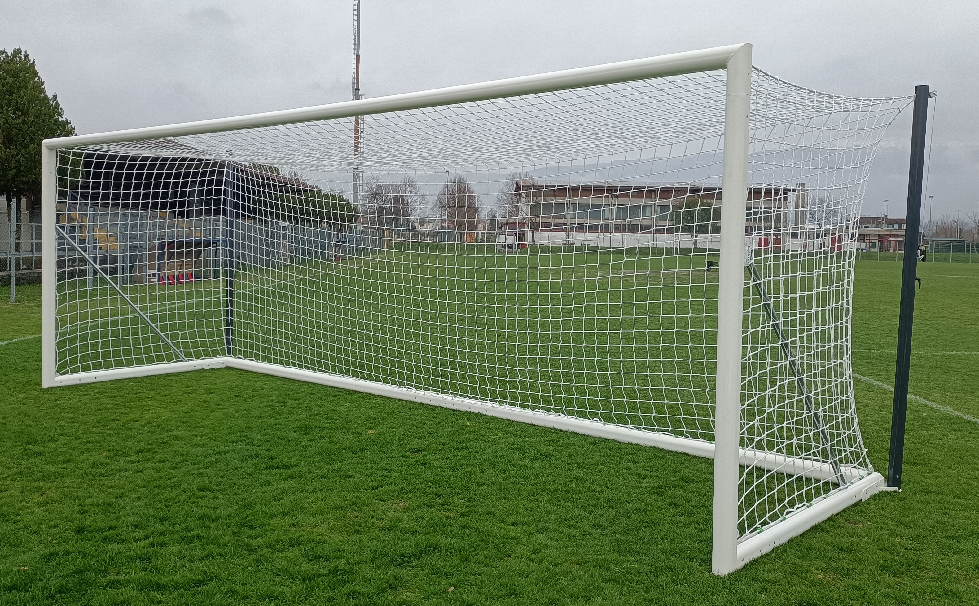 I gomiti sono saldati e le giunzioni interne sono in profilo ad alto spessore in alluminio lega speciale 6005, al fine di rendere la porta ancora più stabile e robusta. Traversa realizzata in due pezzi con sistema "no-gravity" per garantire l'assenza di deformazioni e mantenerla parallela al campo.