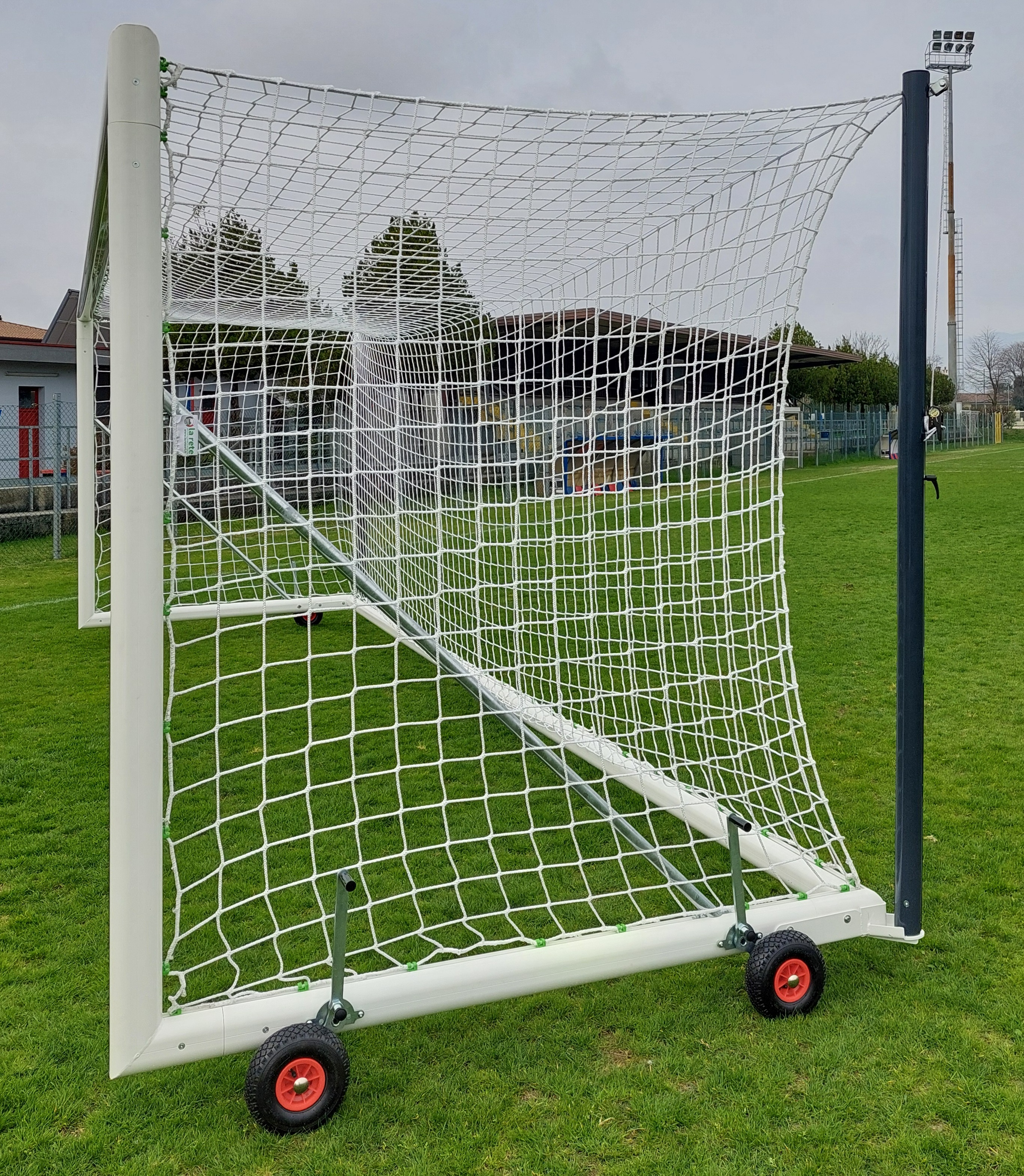 Porta Calcio 7,32x2,44m, mobile, in alluminio, a norma UNI EN 748, con sistema di tensionamento rete con pali posteriori verticali e sistema di trasporto su ruote.