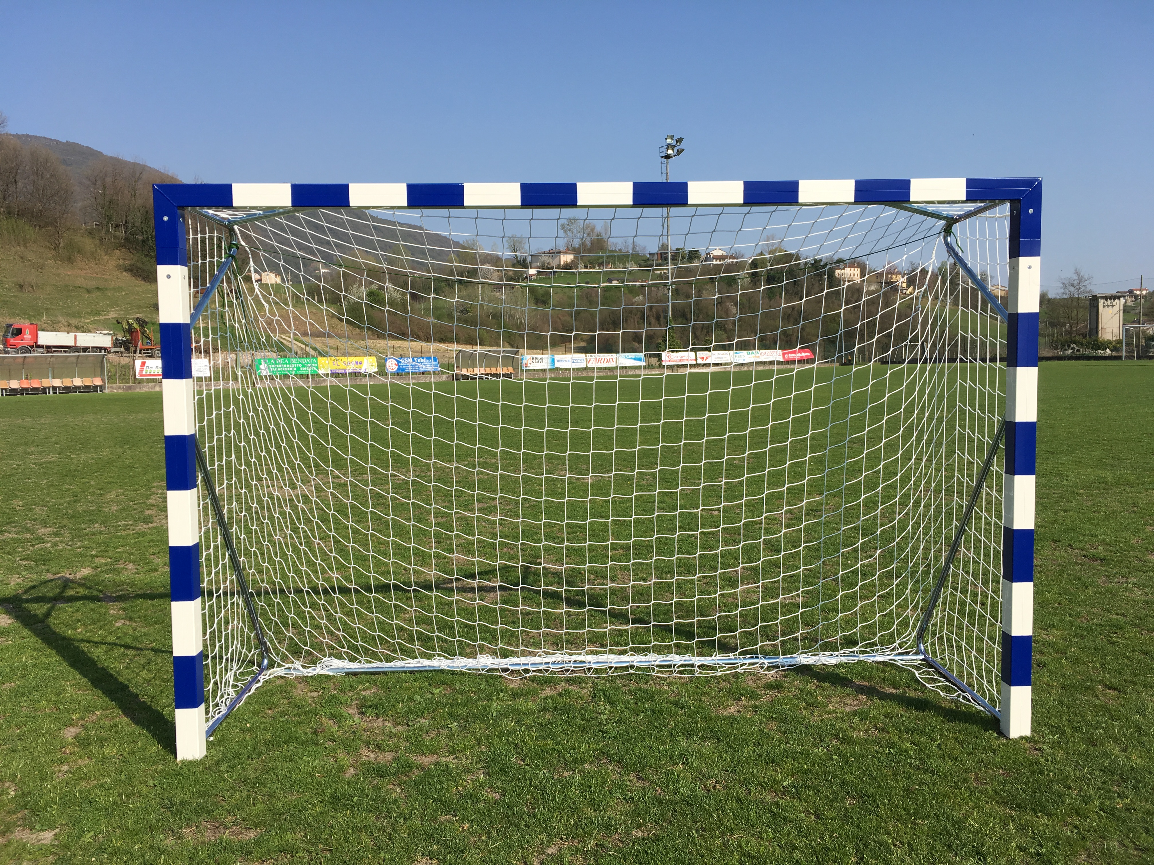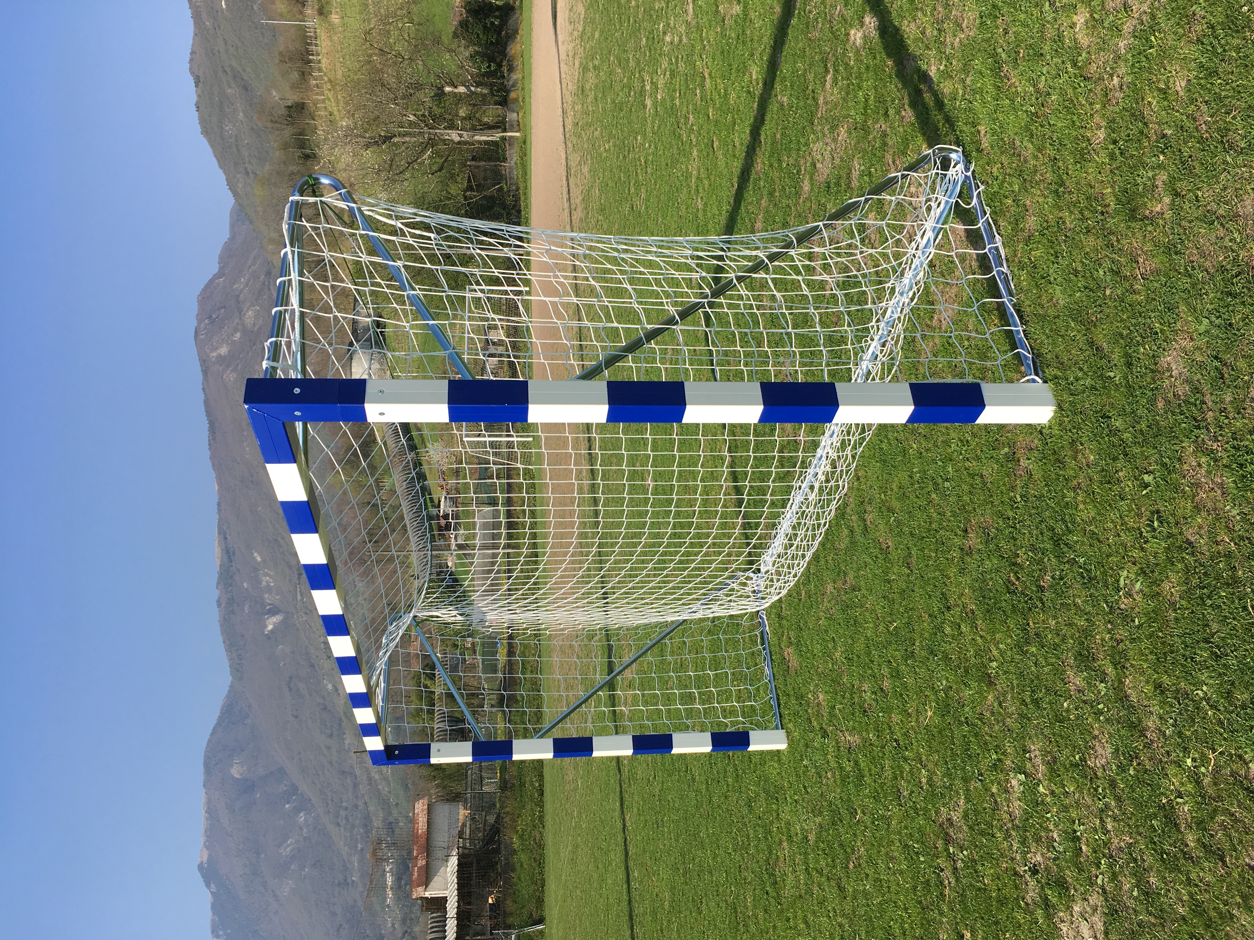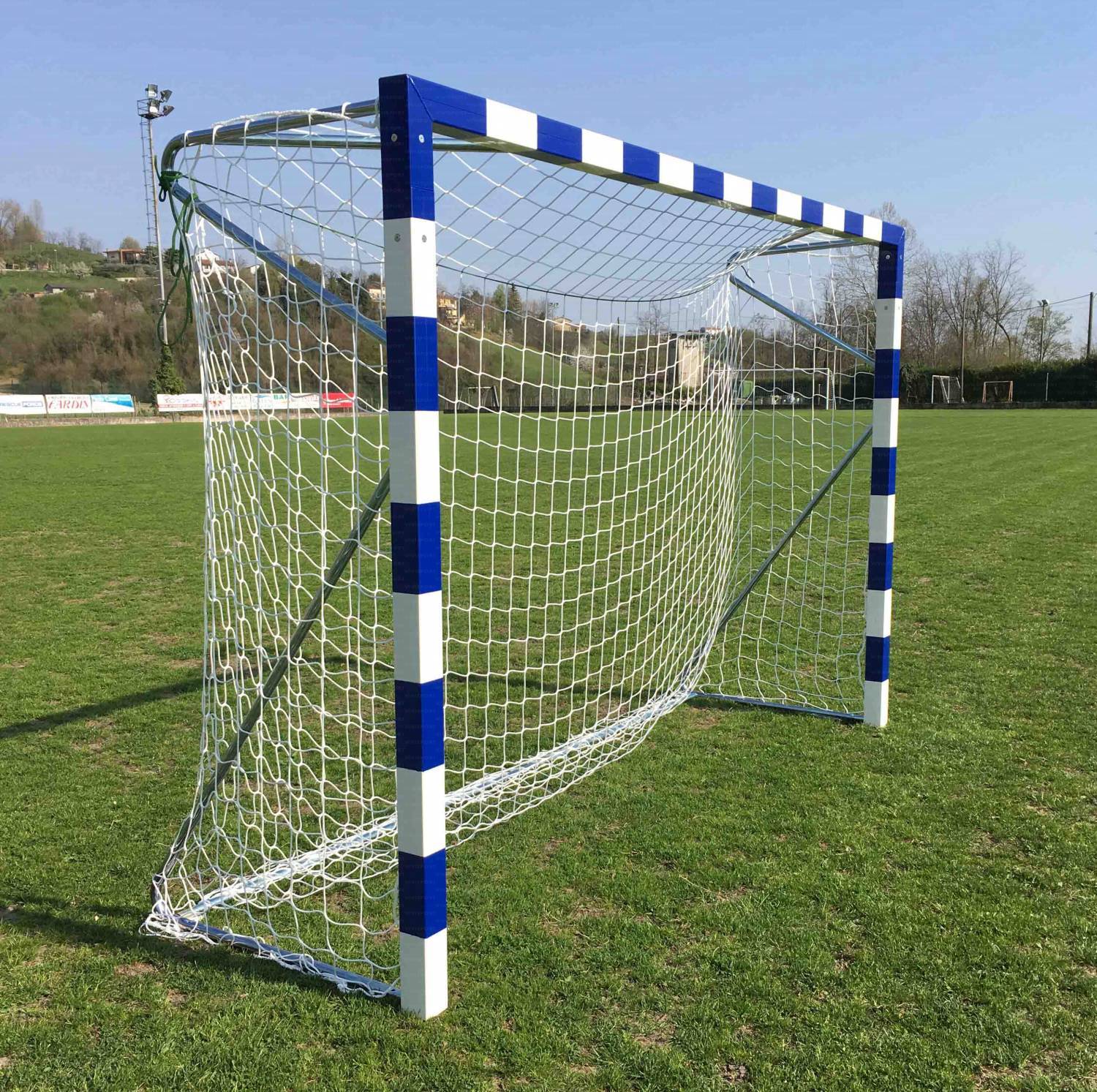 Porte pallamano in alluminio, smontabili in tubolare di alluminio sezione mm.80 x80 verniciate bianco blu, sostegni posteriori in acciaio verniciato tubolare antinfortunistico, predisposto per il fissaggio a terra; dimensioni interne cm.300x200, prof.cm.100.reti escluse
