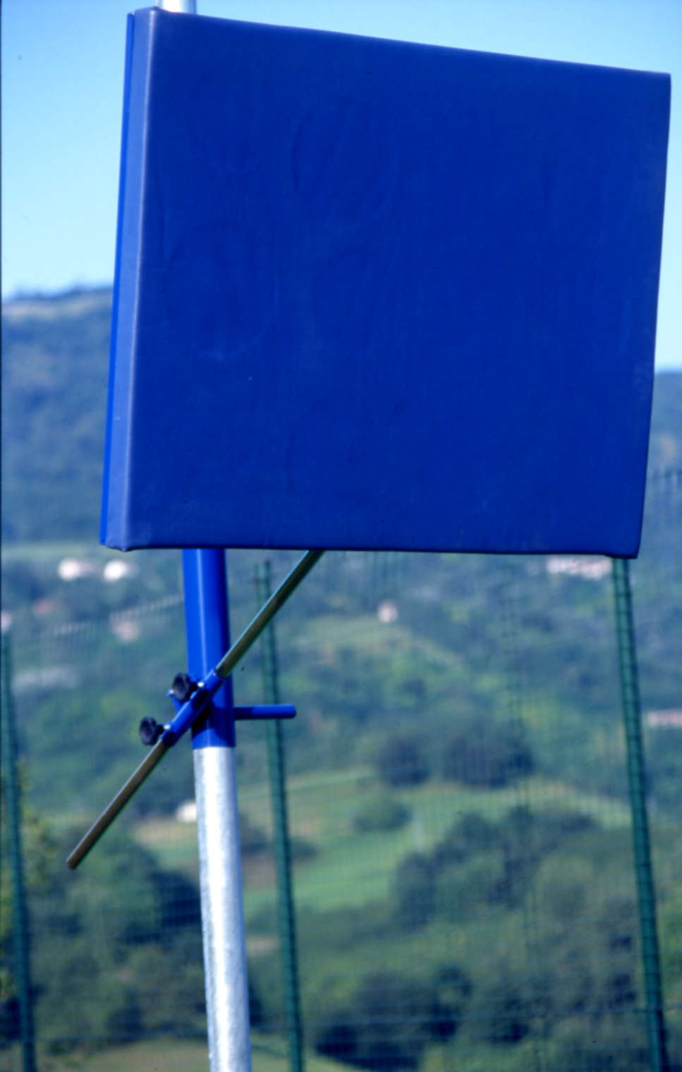 Attrezzo composto da supporto verticale in tubo di acciaio zincato di diametro Ø70mm di lunghezza 3m, pannello rivestito di dimensione 80x105x10cm, posizionabile a piacimento con regolazione di altezza ed inclinazione mediante scorrevole e sistema a leve.