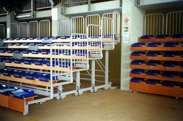 tribuna telescopica struttura portante in acciaio verniciato mediante polveri poliuretaniche termoindurenti, composta da carrelli dotati di montanti verticali e trave di congiunzione, che sorreggono a mensola il telaio orizzontale su cui appoggiano il piano di calpestio ed il piano di seduta . a tribuna aperta, un sistema irrigidente verticale "a cascata" costituito da supporti , puntoni e tiranti, conferisce alla struttura la necessaria rigidita'.piani di calpestio antiscivolo in multistrato fenolico da mm.18 di classe 1.piani di sedute su scocca inviolabile in polipropilene di classe 1 con parte frontale in aderenza al gradone. sistema di bloccaggio delle file automatico, realizzato mediante speciali ganci a "boomerang" che impediscono chiusure accidentali della tribuna. apertura e chiusura manuale con predisposizione alla motorizzazione, realizzata mediante timoni asportabili.la movimentazione, dolce e silenziosa, e' garantita da un sistema di rulli e guide antisbandamento che garantiscono una perfetta funzionalita' evitando attriti radenti ed eventuali operazioni di manutenzione corrimano laterale realizzato in tubolare antinfortunistico. ruote di scorrimento in alluminio con doppio cuscinetto a sfera, rivestite in poliuretano caratteristiche tecniche: disegno nr.1986 lunghezza m.14 (3 moduli da cm.466) numero file 4 scale d' accesso nr.1 parapetti laterali nr.2 posti a sedere nr.114 su panchetta tribuna aperta cm.250 chiusa cm.110 alzata gradoni cm.42, pedana gradoni cm.70 la tribuna telescopica e' costruita per sopportare un carico accidentale di 600 kg./mq.la prima fila di sedute sara' dotata di veletta anteriore realizzata in compensato marino, per impedire l' accesso di palloni da gioco al di sotto della struttura. la presente offerta ha per oggetto,tribune di qualita',con soluzioni tecniche e finiture di categoria superiore.tutti i materiali utilizzati nella realizzazione delle tribune sono dotati di certificato ministeriale di corrispondenza alla classe 1 di reazione al fuoco. i corrimano sono realizzati in tubolare tondo antinfortunistico e la struttura e' costruita secondo quanto previsto dalla normativa antinfortunio le tribune sono garantite 24 mesi su difetti di fabbricazione e verniciatura e sono coperte da polizza responsabilita' civile prodotti. ad installazione avvenuta, verra' fornita idonea relazione di calcolo realizzata a cura di un ingegnere abilitato trasporto incluso (in prov.brescia) posa in opera inclusa (in prov.brescia)