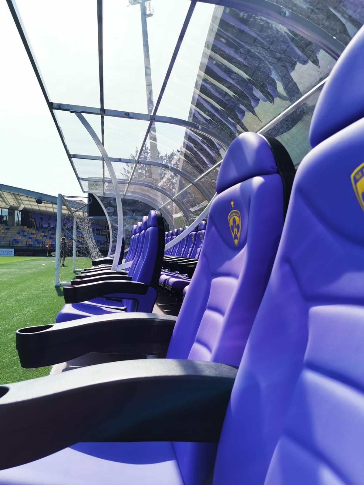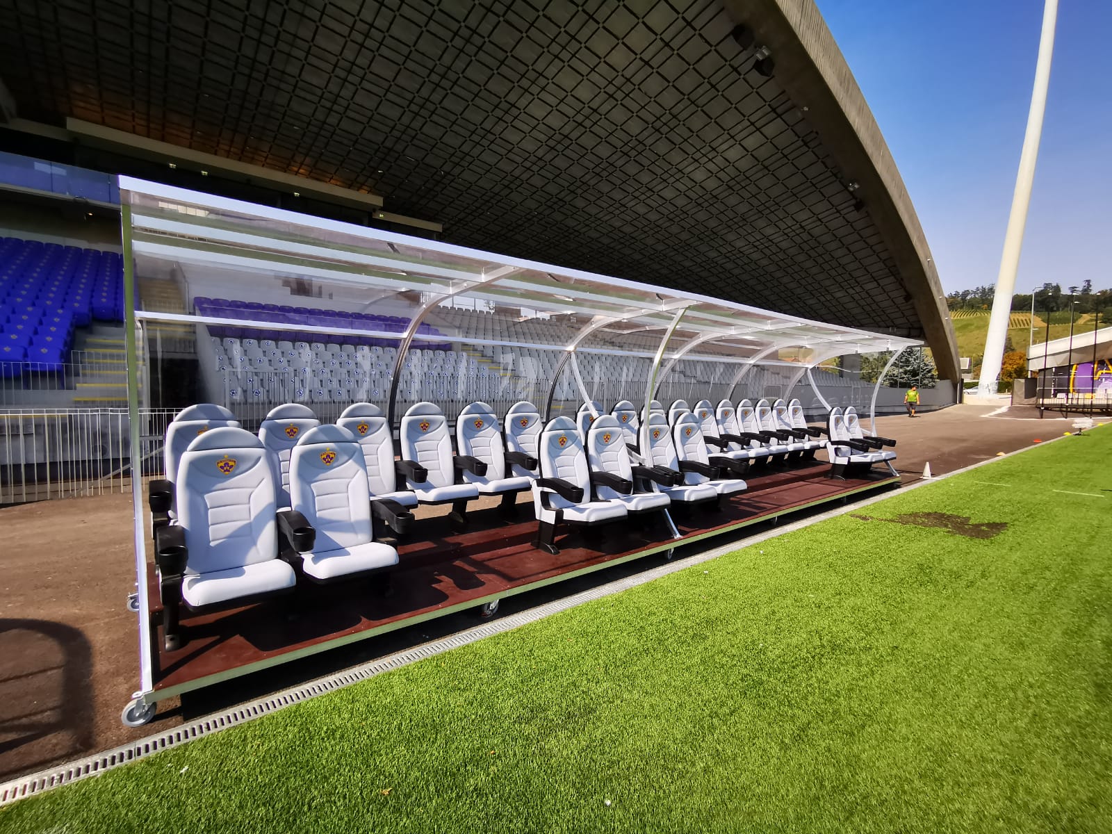 Realizzazione di tre panchine bordo campo modello "World Cup" (nostro articolo 6206), con una capacità totale di 51 posti a sedere, complete di sedute comfort con logo ricamato e bracciolo dotato di portabicchieri.